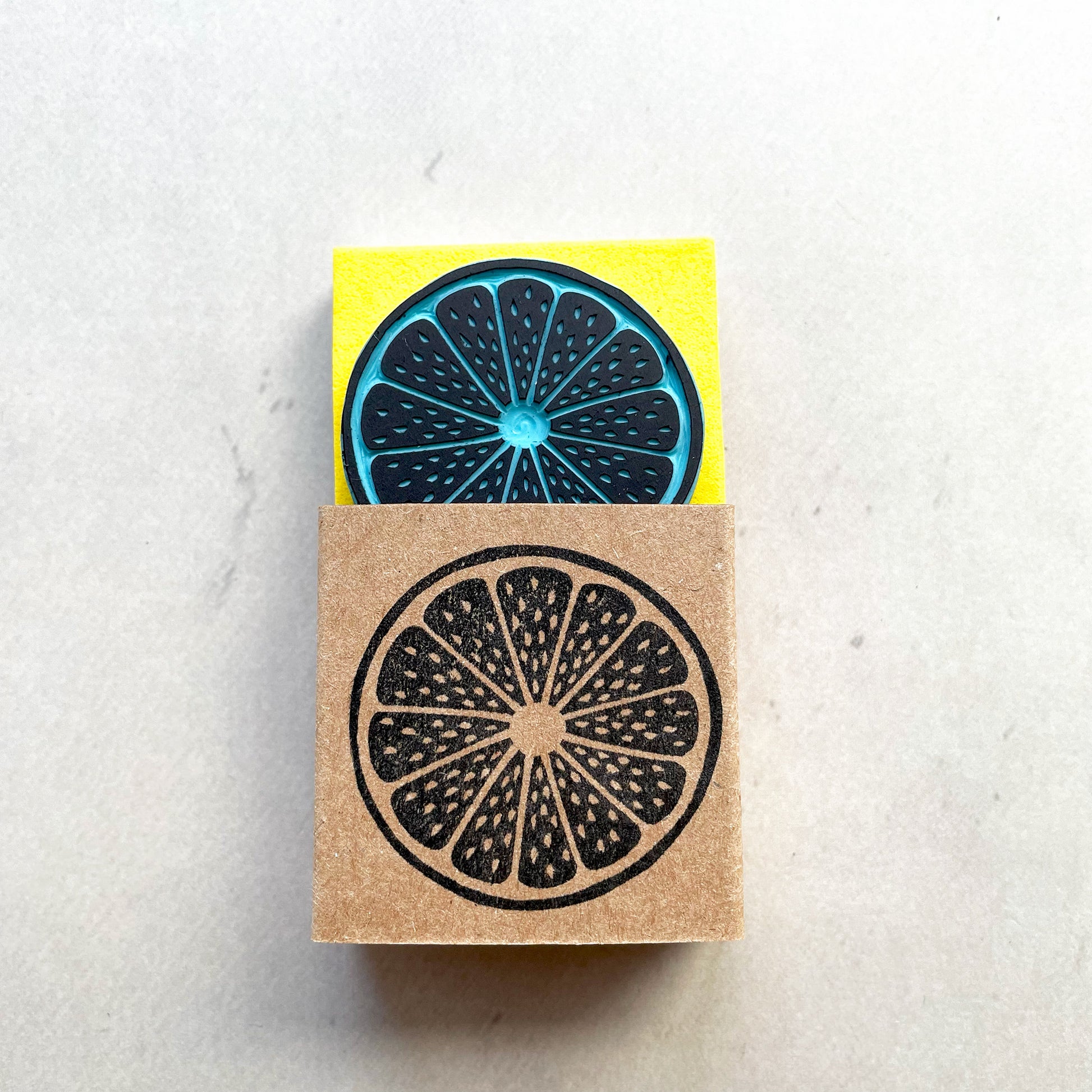 Hand carved rubber stamp of a lemon, two designs to choose from