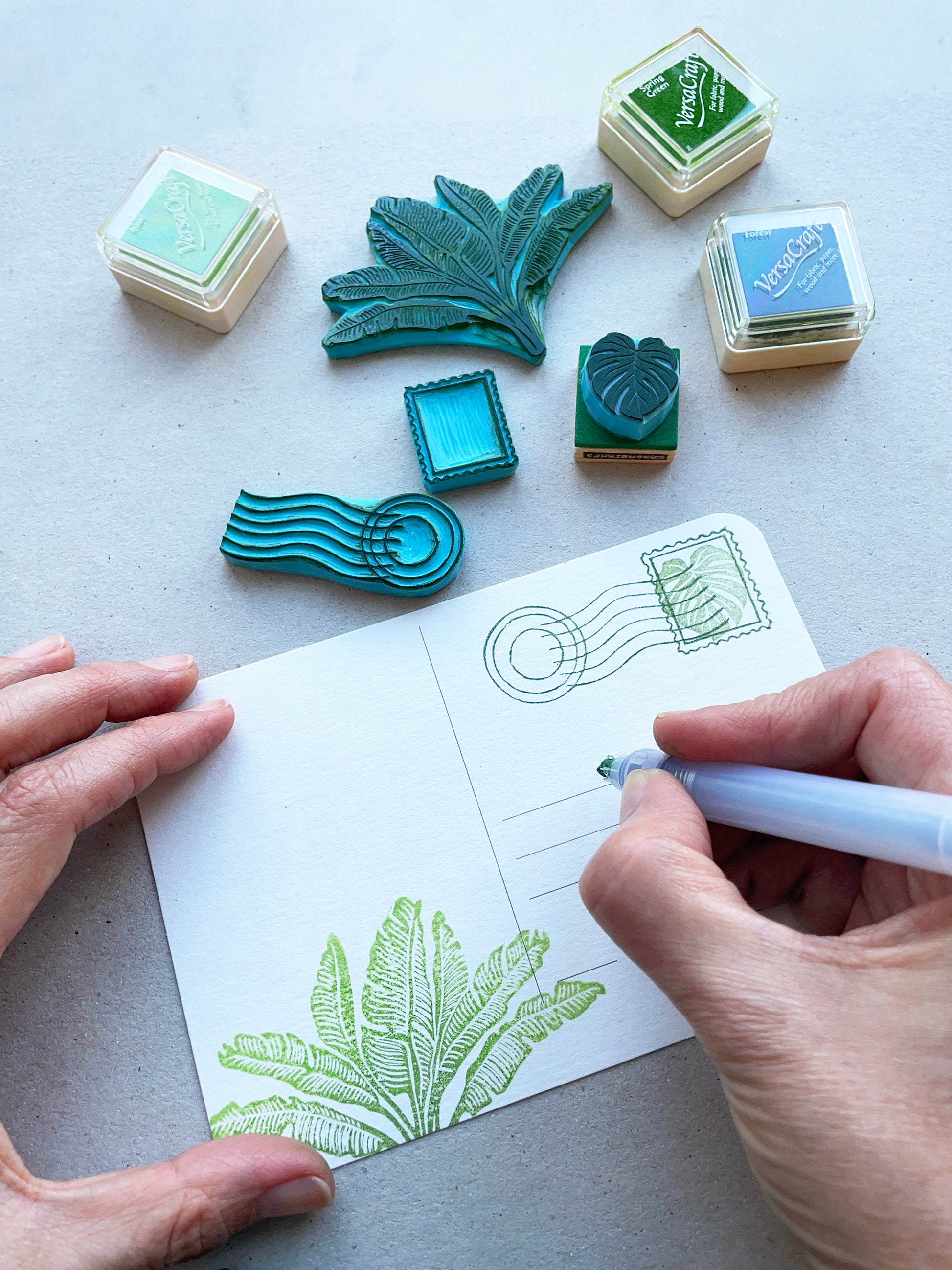 Hand carved rubber stamps of postage stamps for perfect to create your own postcards to sedn to family and friends